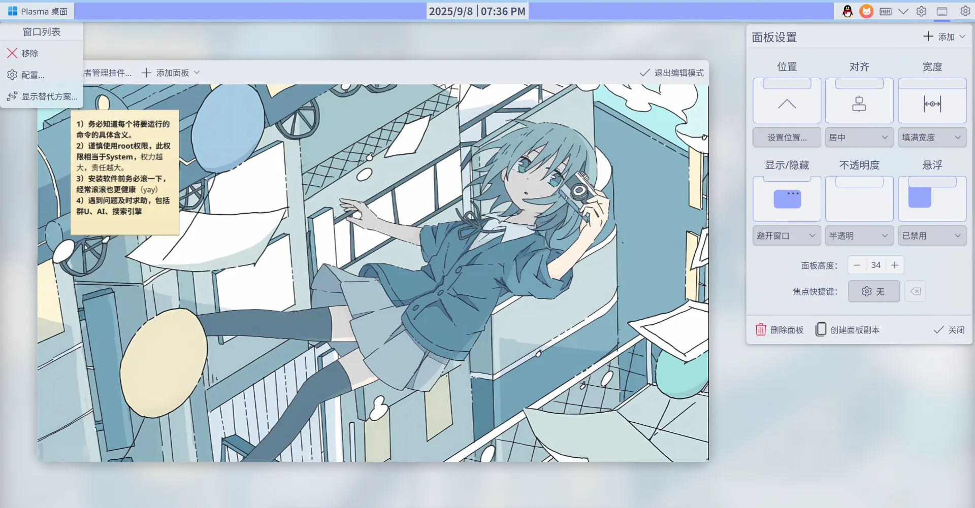 我使用的是此发行版预装的KDE桌面环境,与其他桌面环境有一个优点就是自定义程度高,例如上图的“Dock”和“Finder”,实际为两个面板,每个面板都可以单独自定义属性和内容: