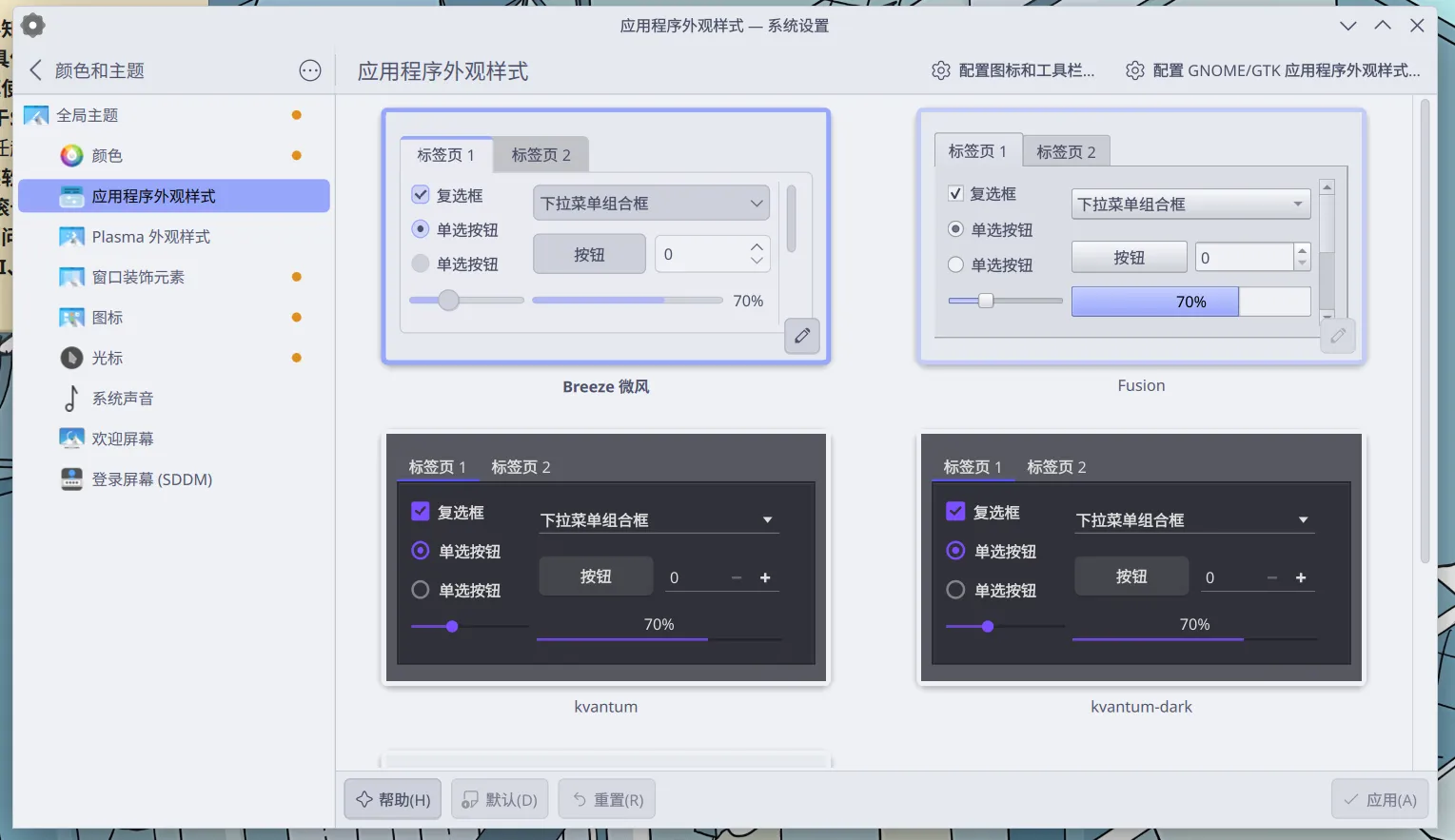 项目 值 注释 配色 Catppuccin Latte Lavender 这是一个配色方案标准,色彩柔和,支持数百种接口,其中也包括了KDE。 应用程序外观样式 Breeze微风 默认的已经很好看了。 Plasma外观样式 Breeze微风 窗口装饰元素 Breeze微风 以前用的是其他的,但因为这个原因,导致换回默认的了。 图标 Fluent 设计的比较清爽,但是也有风格不一致的问题。