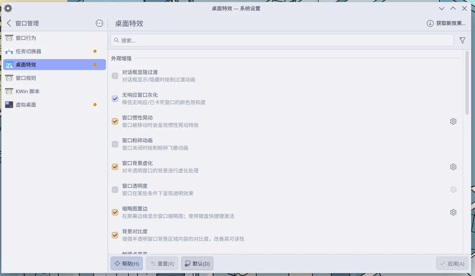 这是我将文件管理器从左边快速拖到右边的截图,只需要进入设置->动效->桌面特效,打开窗口惯性晃动,就可以开启了,自带的: