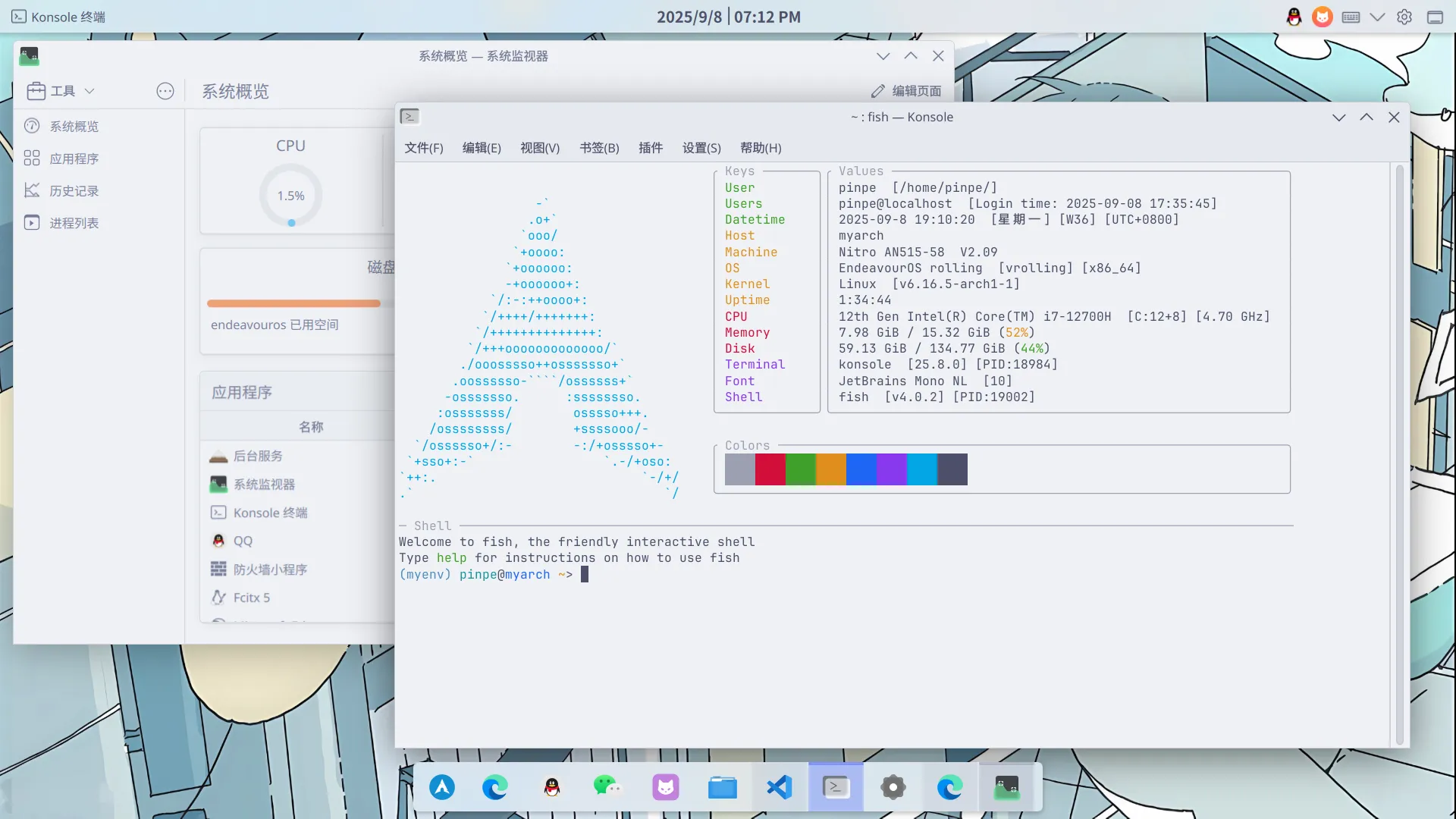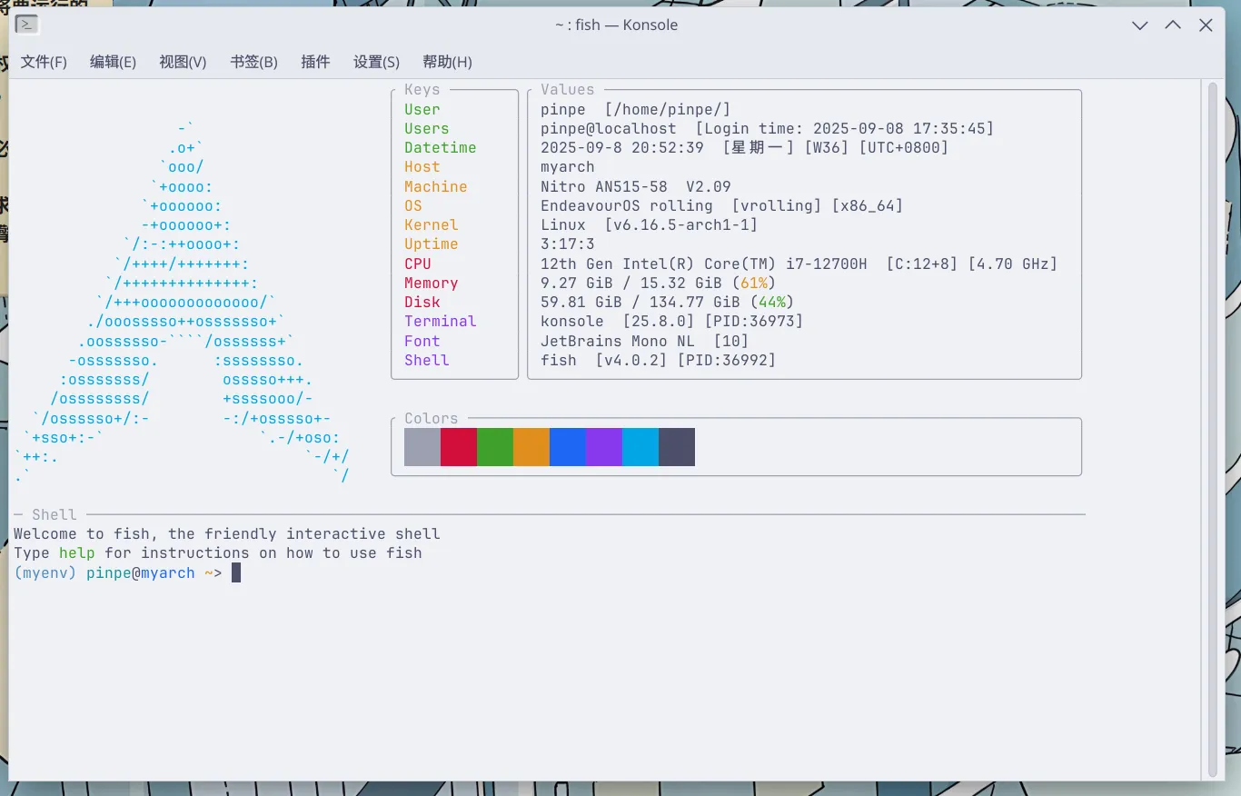 我使用的是KDE自带的Konsole终端,Shell默认为Fish,主题为Catppuccin Latte,以下是进入终端时的样子: