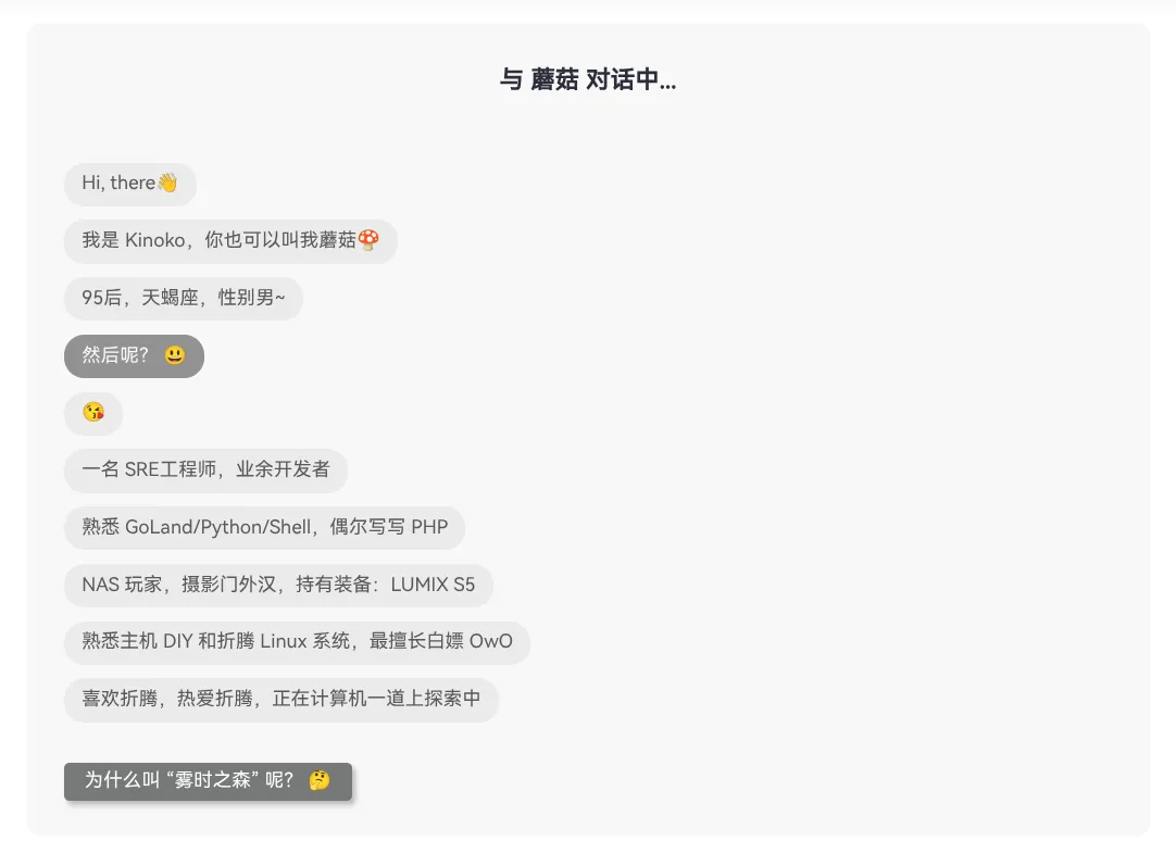 最近关于页更新了,使用了一个很新颖的对话式 UI,有聊天的感觉,不再是枯燥的页面。