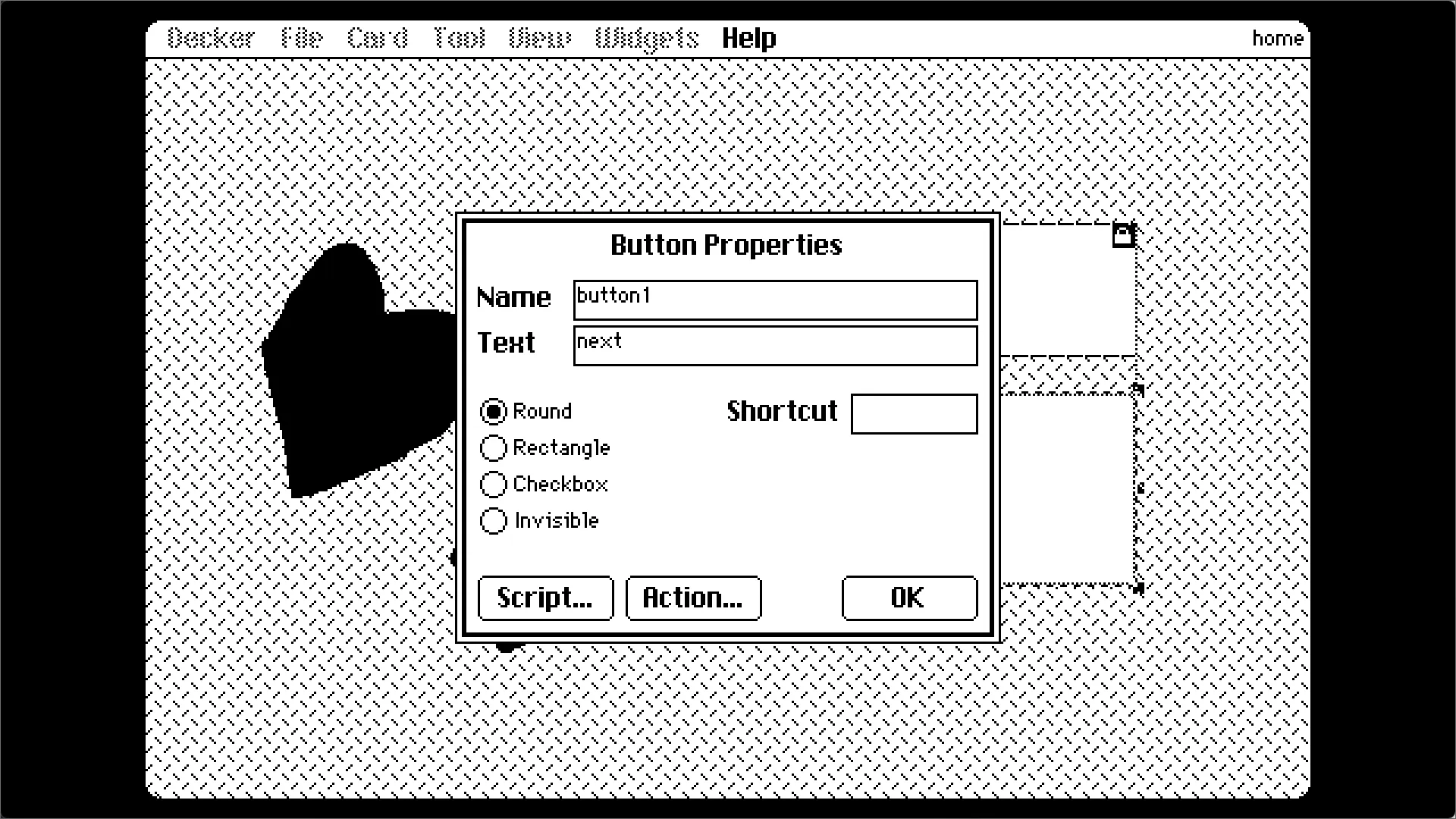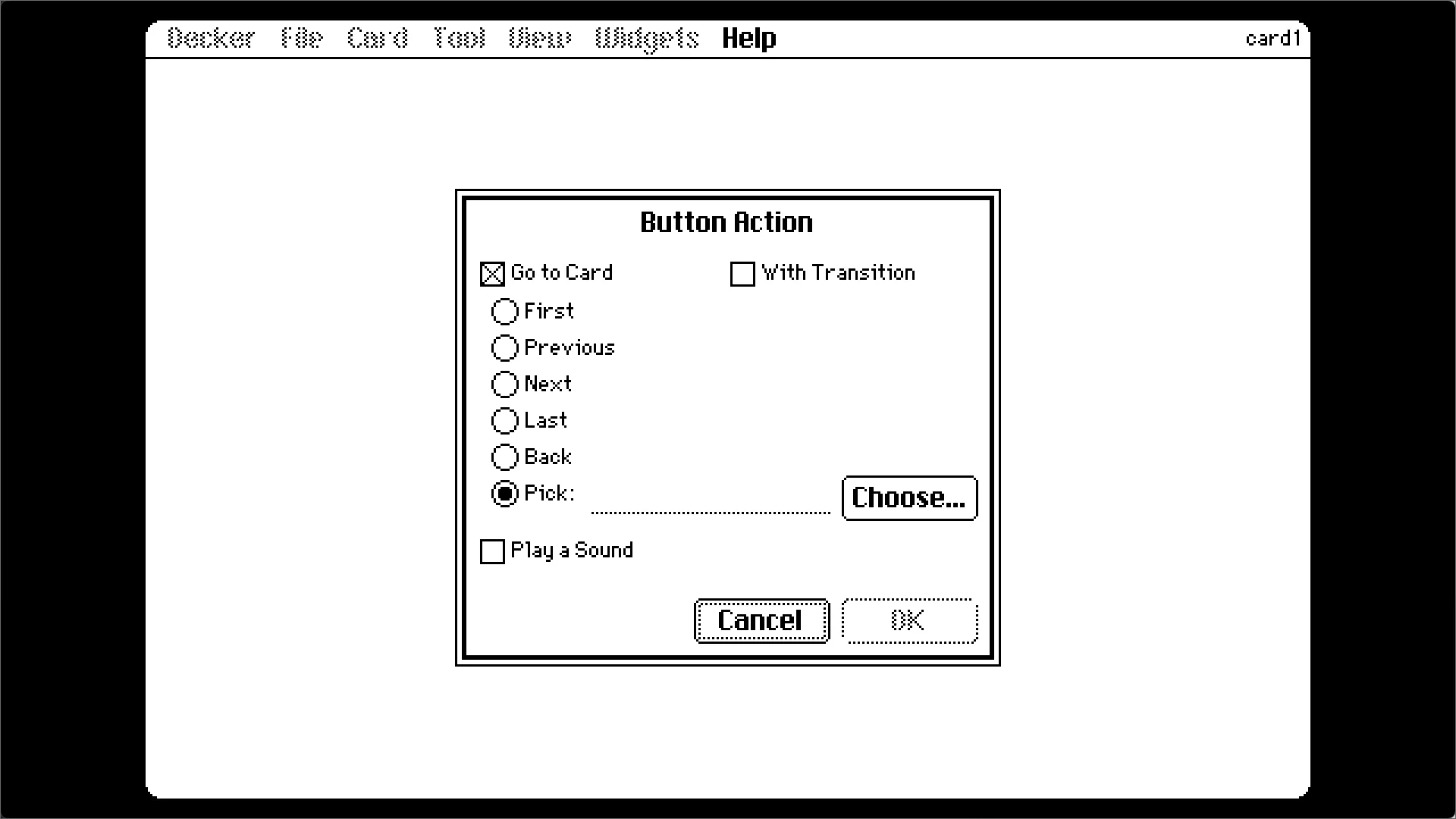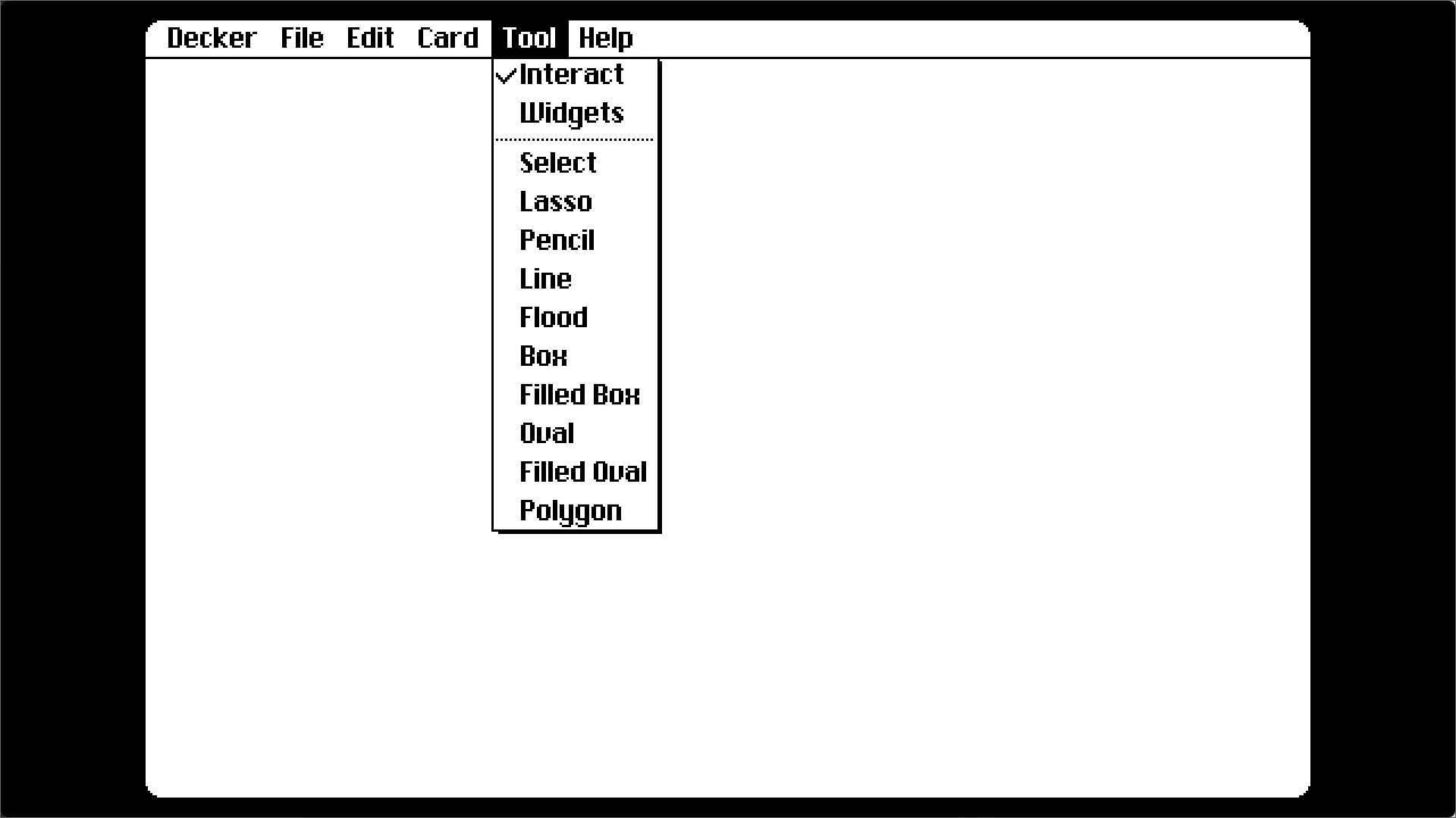 Interact:类似于预览,可以以用户的身份与Windget(控件)交互。Widgets:Windget模式,用于管理和添加此Card上的Windget。Select:矩形框选背景。(不包括Windget)Lasso:不规则框选背景。Pencil:画笔工具,可以在背景上画画。Line:在背景上画线段。Flood:油漆桶工具。Box:画出空心矩形。Filled Box:画出实心矩形。Oval:空心圆。Filled Oval:实心圆。Polygon:不规则实心形状。