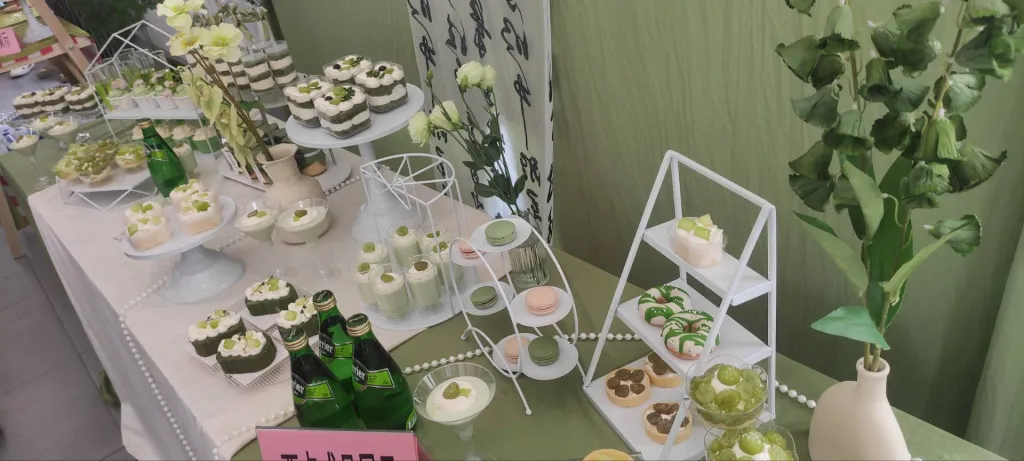 西点烘焙专业,也是学生做的,和蛋糕店别无二致,绿色系很养眼,真是高技术力。(看着我都想报了,每天都能吃到好吃的~~,也可能是黑暗料理~~)