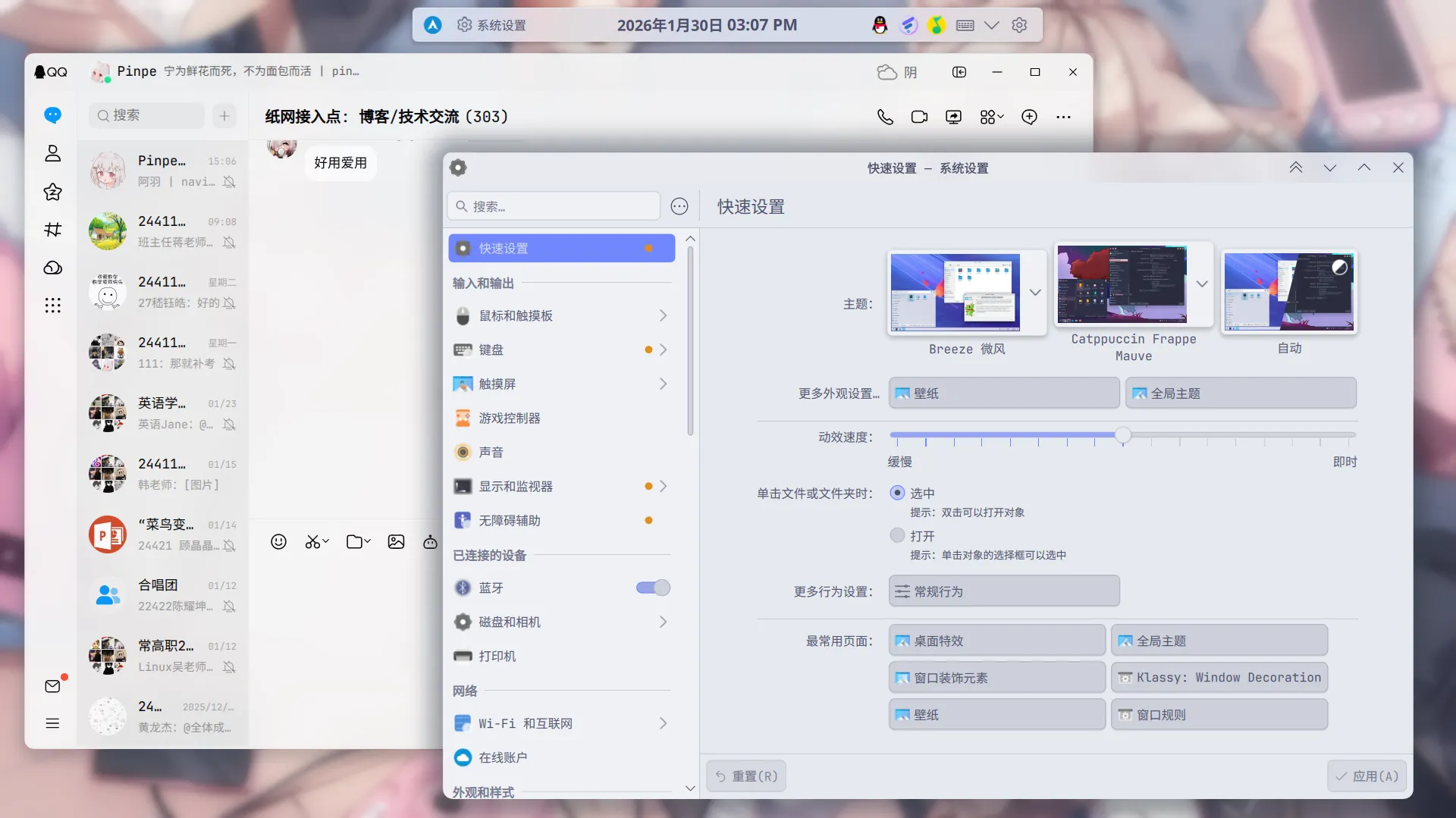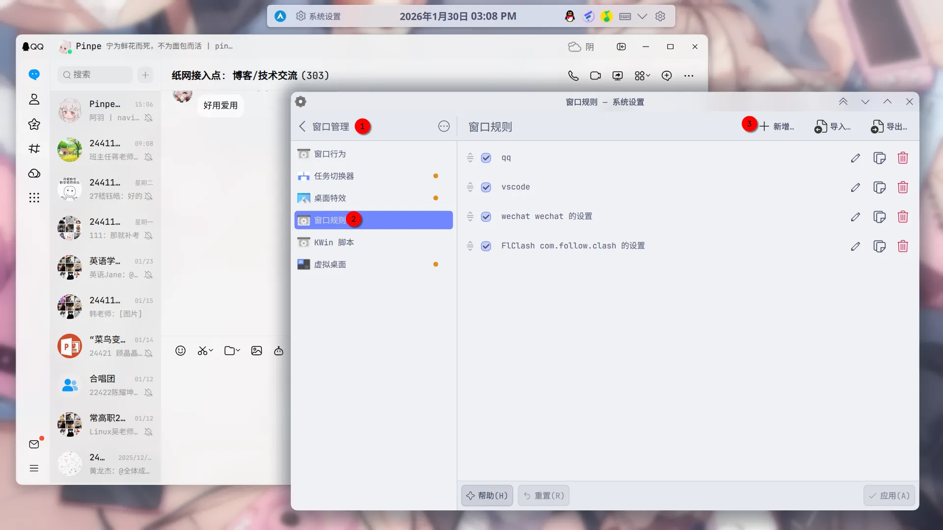 检测窗口属性 > 单击QQ窗口 > 添加窗口类 > 匹配整个窗口类 > 添加属性 > 活动不透明度和非活动不透明度分别改为90%和95%。