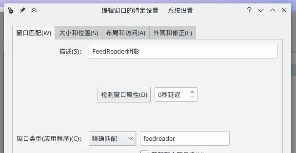 进入系统设置下的窗口管理分类,打开窗口规则选项,点击右侧的新建按钮新建一个配置,并将匹配选项卡下相关条目如图填写(对于 FeedReader):