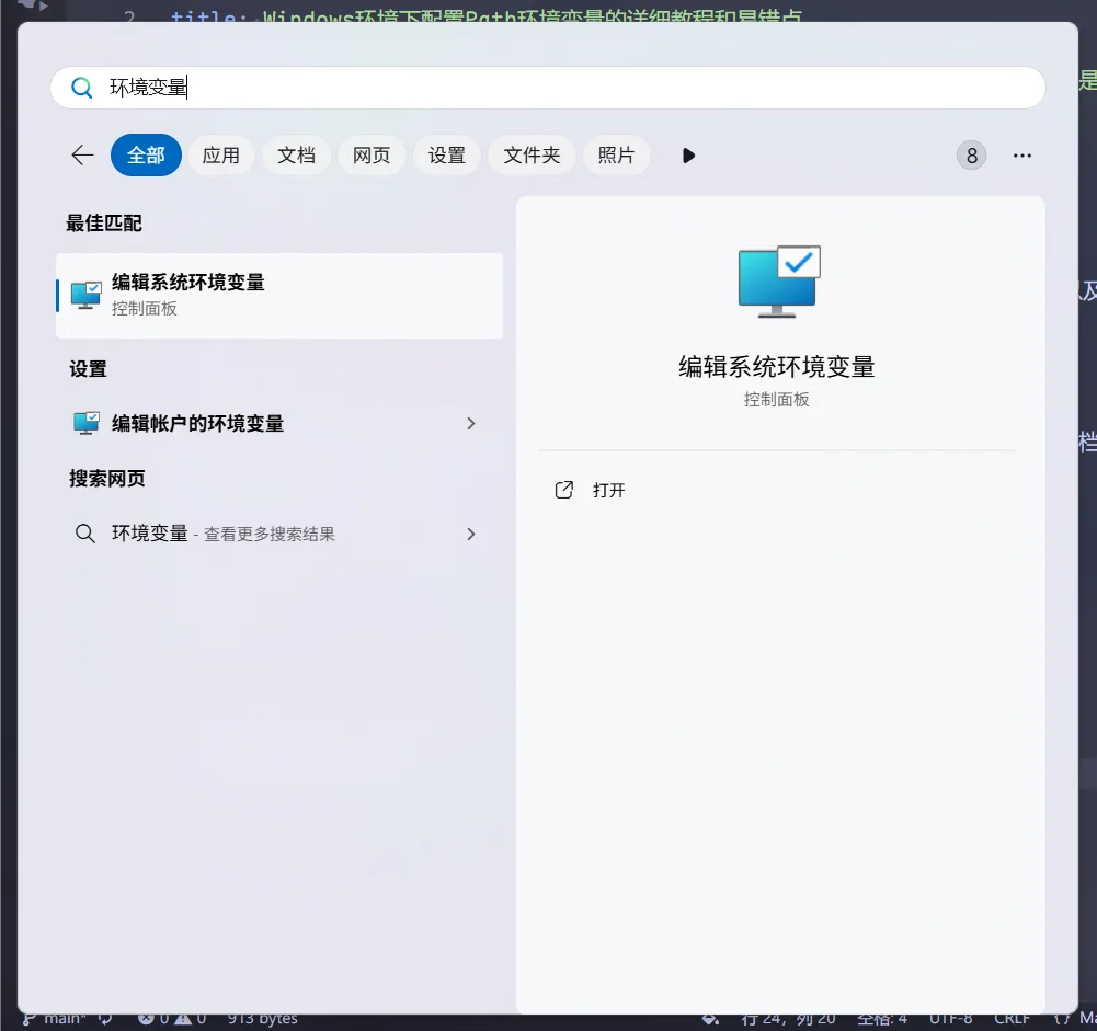 打开开始菜单,搜索环境变量,选择编辑系统环境变量: